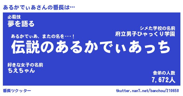| 伝説のあだ名 | 『伝説のスナイパーあるかでぃあ』 |