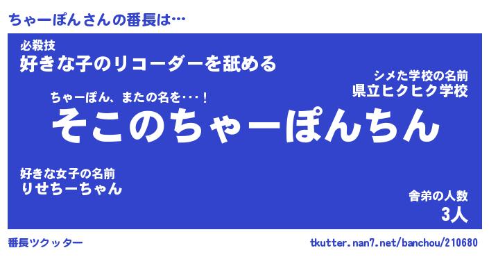 | 男性向けラノベタイトル風あだ名 | 『ちゃーぽんの憂鬱』 |