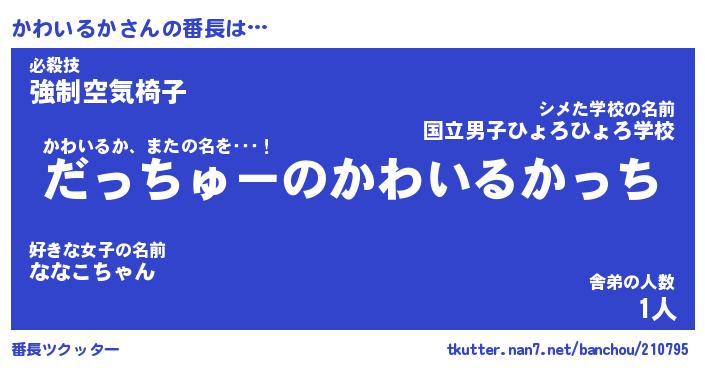 | ファンタジー風あだ名 | 『カワフェル』『エターナルカワイルカー』 |