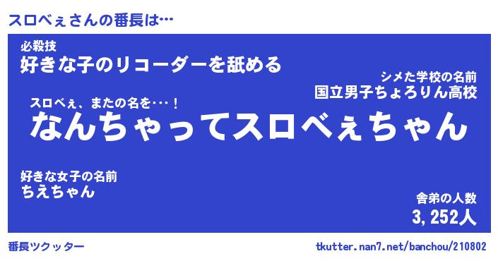 | 意味不明あだ名 | 『ペロリンスロべぇ』『永久保存スロべぇ』 |