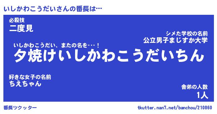 | 男性向けラノベタイトル風あだ名 | 『イシカワコウダイアートオンライン』 |