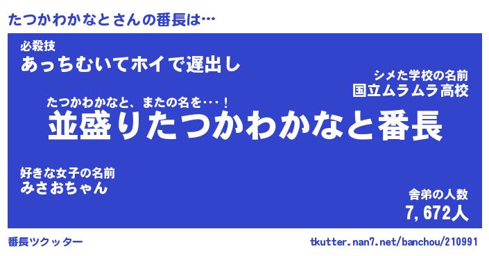 | 男性向けラノベタイトル風あだ名 | 『たつかわかなとの憂鬱』 |