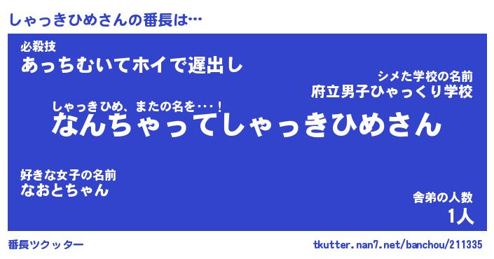| 伝説のあだ名 | 『伝説のスナイパーしゃっきひめ』 |
