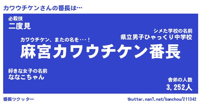 | ヒーロー風カッコイイあだ名 | 『スーパーカワウチケン』『幻影騎士カワ』 |