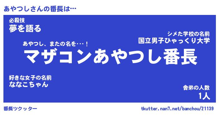 | 意味不明あだ名 | 『ペロリンあやつし』『永久保存あやつし』 |