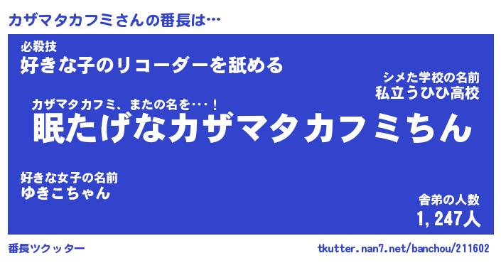 | ヘコむあだ名 | 『カザにー』『酢こんぶ』『カザを』 |