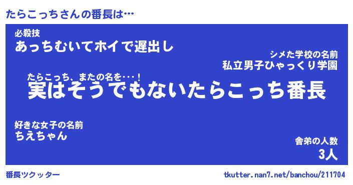 | ヒーロー風カッコイイあだ名 | 『スーパータラコッチ』『魔戒騎士タラ』 |