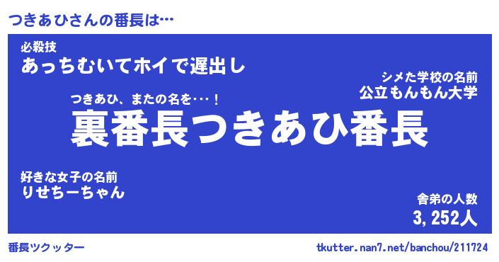 | 男性向けラノベタイトル風あだ名 | 『ツキアヒアートオンライン』 |