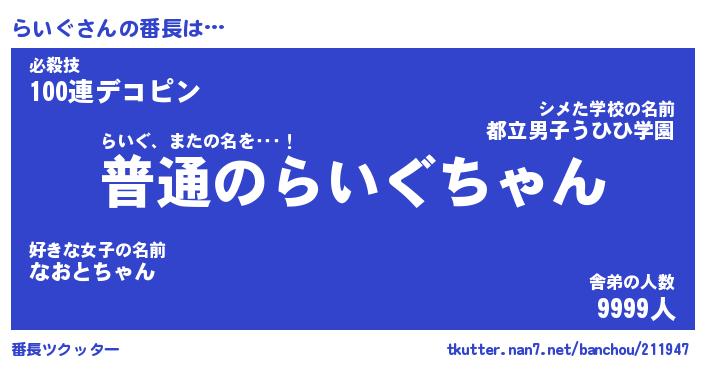 | 意味不明あだ名 | 『ペロリンらいぐ』『らいぐフォーエバー』 |