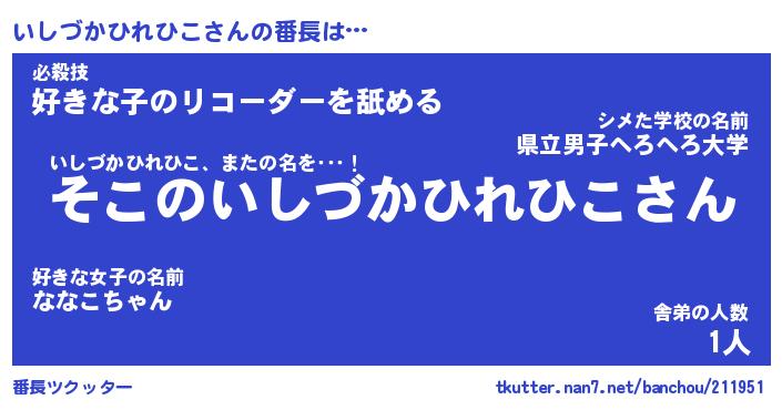 | 男性向けラノベタイトル風あだ名 | 『いしづかひれひこの憂鬱』 |