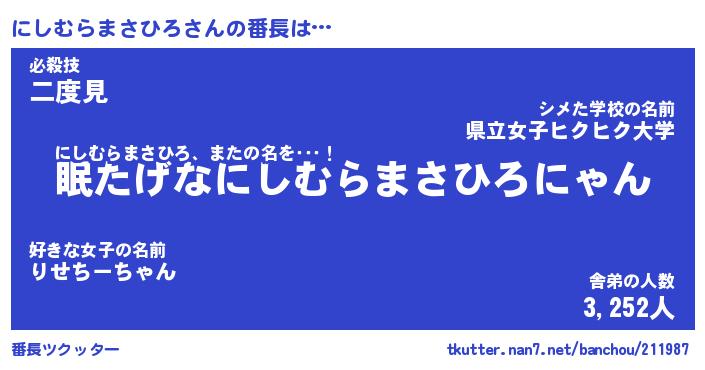 | ヘコむあだ名 | 『にしもー』『酢こんぶ』『にしっ子』 |