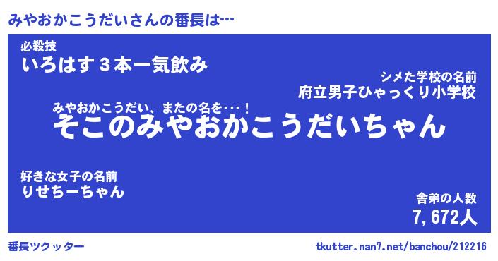 | ピコ太郎風あだ名 | 『ミコ六郎』『ピミ四郎』『ミヤ三郎』 |
