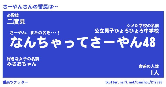 | 伝説のあだ名 | 『伝説のスナイパーさーやん』 |