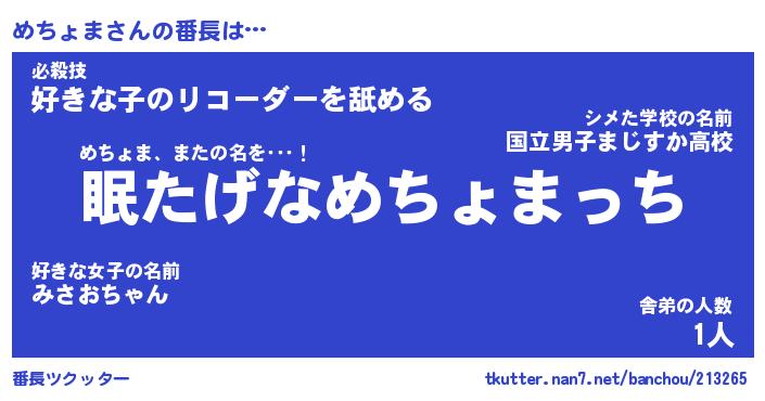 | 意味不明あだ名 | 『ペロリンめちょま』『永久保存めちょま』 |