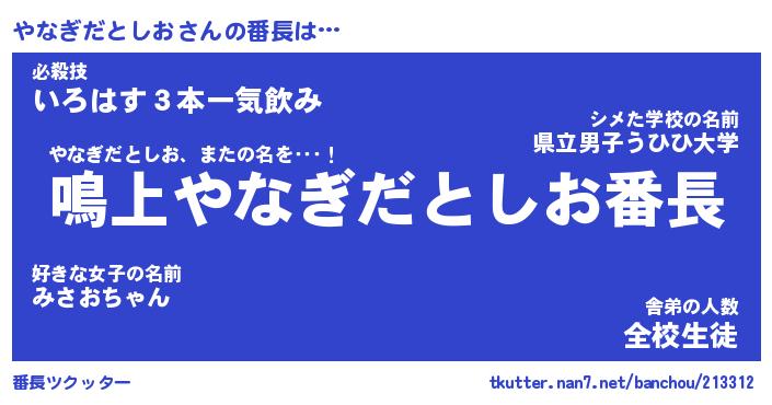 | 伝説のあだ名 | 『封印されしスナイパーやなぎだとしお』 |