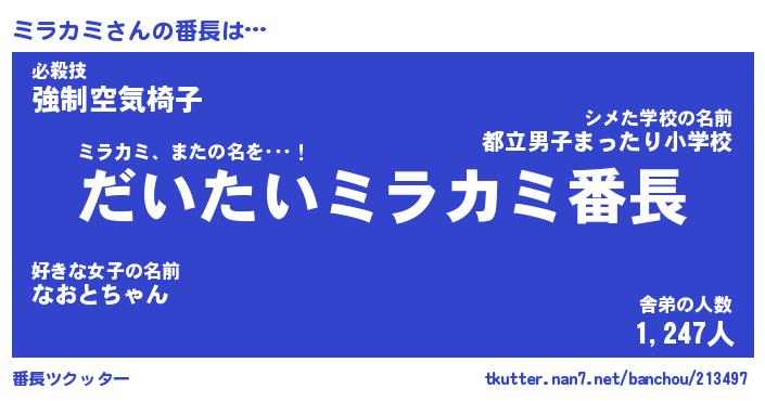 | ヒーロー風カッコイイあだ名 | 『スーパーミラカミ』『天弓騎士ミラ』 |