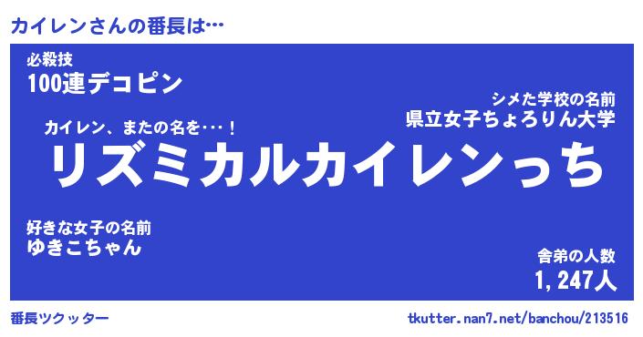 | 意味不明あだ名 | 『ペロリンカイレン』『永久保存カイレン』 |