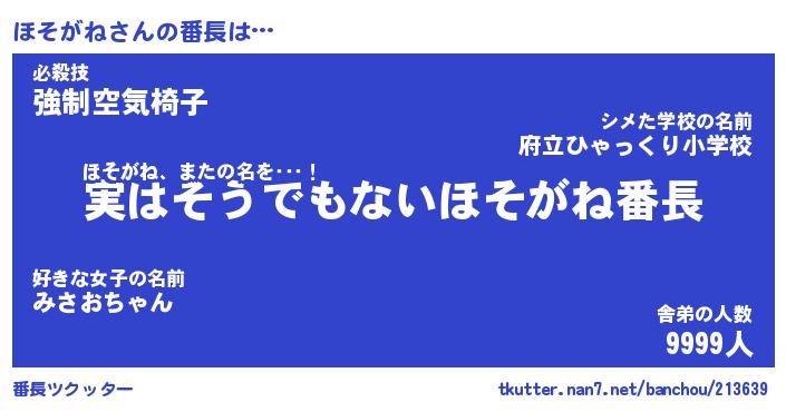 | 肩書あだ名 | 『ほそがね社長』『ほそがね総理大臣』 |