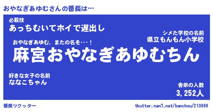 | 男性向けラノベタイトル風あだ名 | 『オヤナギアユムアートオンライン』 |