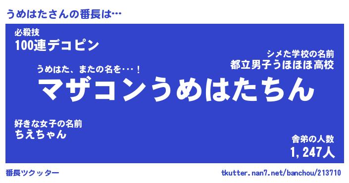 | ヒーロー風カッコイイあだ名 | 『スーパーウメハタ』『銀牙騎士ウメ』 |
