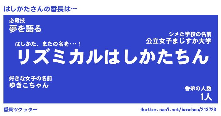 | 肩書あだ名 | 『はしかた御曹司』『はしかた国家主席』 |
