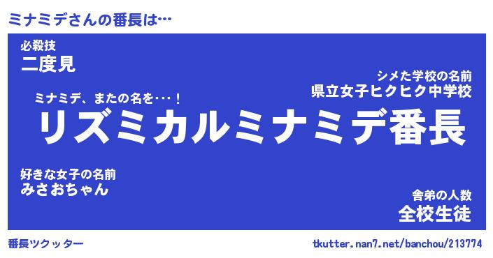 | 意味不明あだ名 | 『ペロリンミナミデ』『永久保存ミナミデ』 |