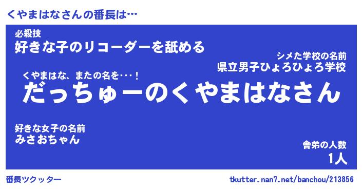 | ヘコむあだ名 | 『くやもー』『なまこ酢』『くやお』 |