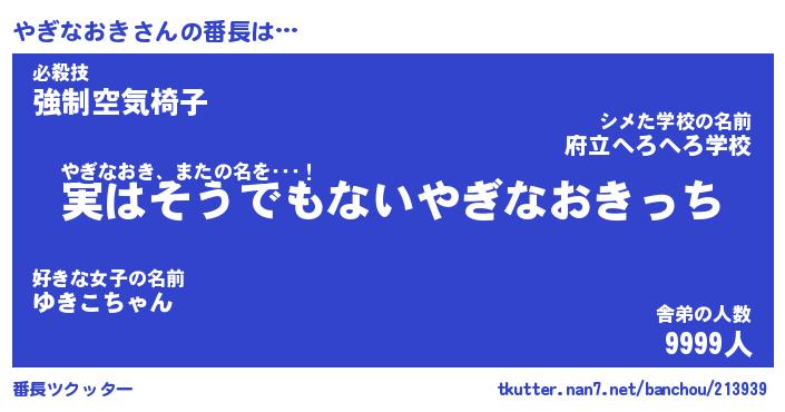 | 伝説のあだ名 | 『封印されしスナイパーやぎなおき』 |