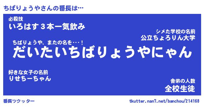 | ヒーロー風カッコイイあだ名 | 『スーパーチバリョウヤ』『銀牙騎士チバ』 |