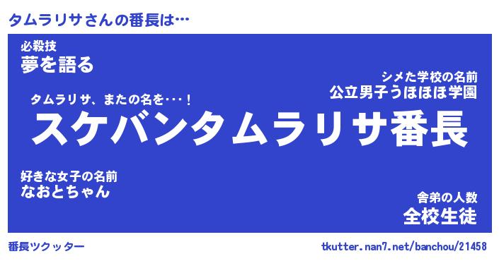 | ヒーロー風カッコイイあだ名 | 『スーパータムラリサ』『天弓騎士タム』 |