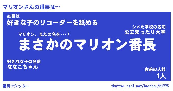 | 意味不明あだ名 | 『ペロリンマリオン』『永久保存マリオン』 |