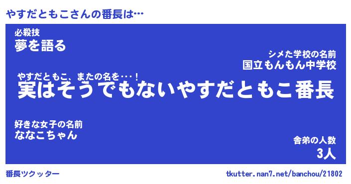 | 伝説のあだ名 | 『封印されしスナイパーやすだともこ』 |