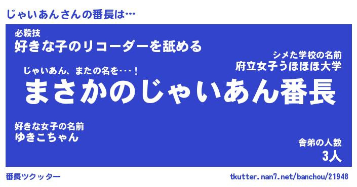 | ヘコむあだ名 | 『じゃもー』『なまこ酢』『じゃ太郎』 |