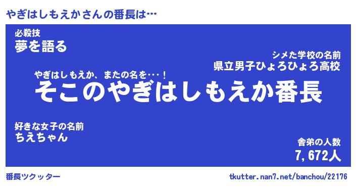 | 伝説のあだ名 | 『不死鳥のスナイパーやぎはしもえか』 |