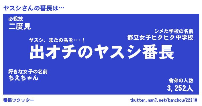 | ヒーロー風カッコイイあだ名 | 『スーパーヤスシ』『ウルトラヤスシマン』 |