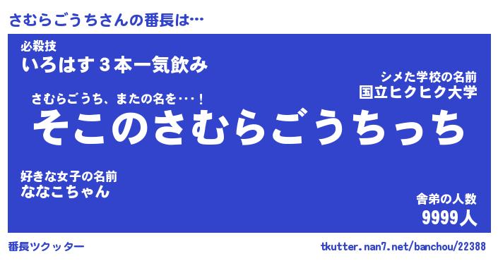 | ヒーロー風カッコイイあだ名 | 『スーパーサムラゴウチ』『天弓騎士サム』 |