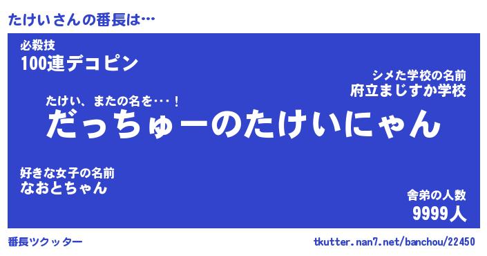 | ヒーロー風カッコイイあだ名 | 『スーパータケイ』『ウルトラたけいマン』 |