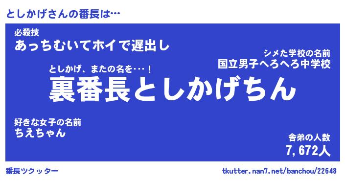 | 意味不明あだ名 | 『ペロリンとしかげ』『永久保存としかげ』 |