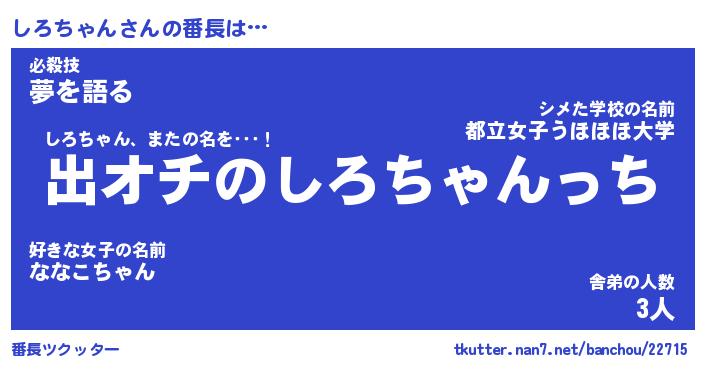 | 男性向けラノベタイトル風あだ名 | 『しろちゃんの憂鬱』 |