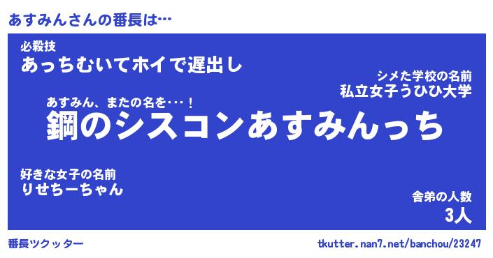 | ヘコむあだ名 | 『あすふぇ~』『なまこ酢』 |