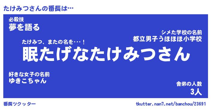 | ファンタジー風あだ名 | 『タケフェル』『エターナルタケミツー』 |