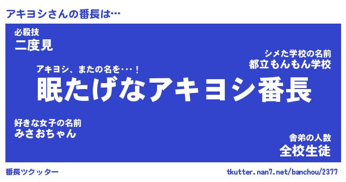 | ヒーロー風カッコイイあだ名 | 『スーパーアキヨシ』『暗黒騎士アキ』 |