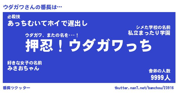 | ヒーロー風カッコイイあだ名 | 『スーパーウダガワ』『暗黒騎士ウダ』 |