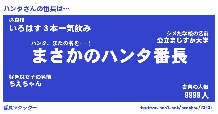 | ポケモン風あだ名 | 『ハンチュウ』『ハンタダネ』 |