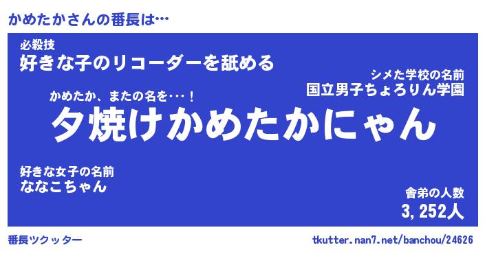 | 意味不明あだ名 | 『ペロリンかめたか』『永久保存かめたか』 |