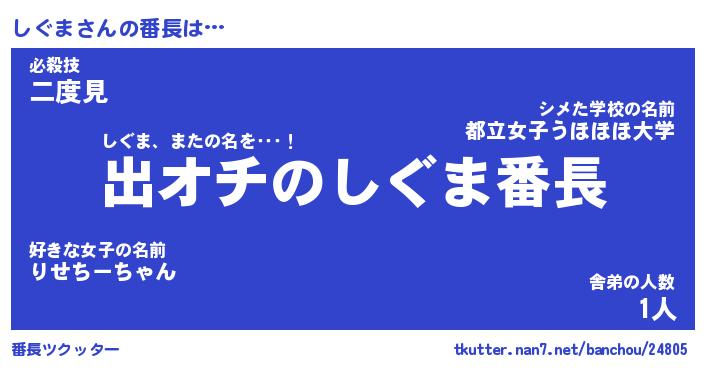 | 伝説のあだ名 | 『伝説のスナイパーしぐま』 |