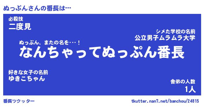 | 男性向けラノベタイトル風あだ名 | 『ぬっぷんの憂鬱』 |