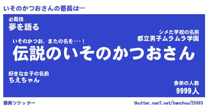 | ヒーロー風カッコイイあだ名 | 『スーパーイソノカツオ』『銀牙騎士イソ』 |