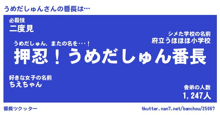 | ヒーロー風カッコイイあだ名 | 『スーパーウメダシュン』『銀牙騎士ウメ』 |