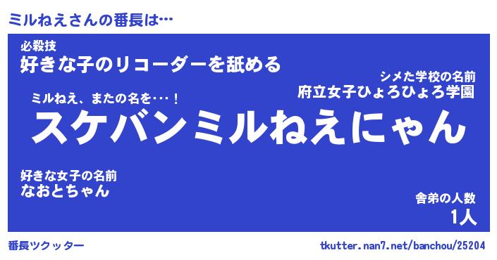 | 意味不明あだ名 | 『ペロリンミルねえ』『永久保存ミルねえ』 |